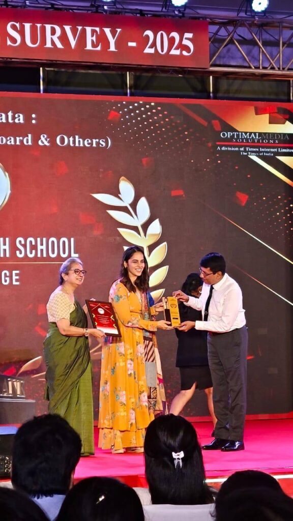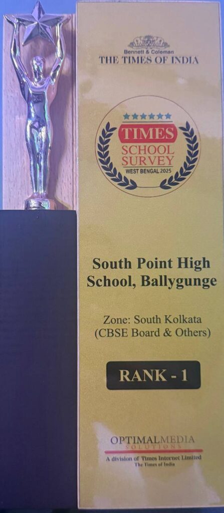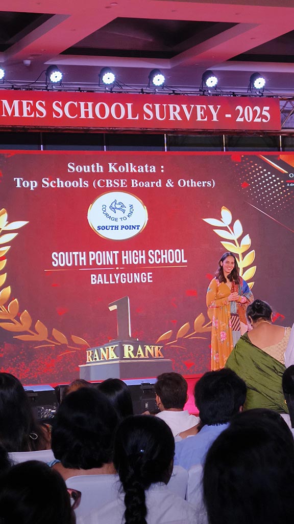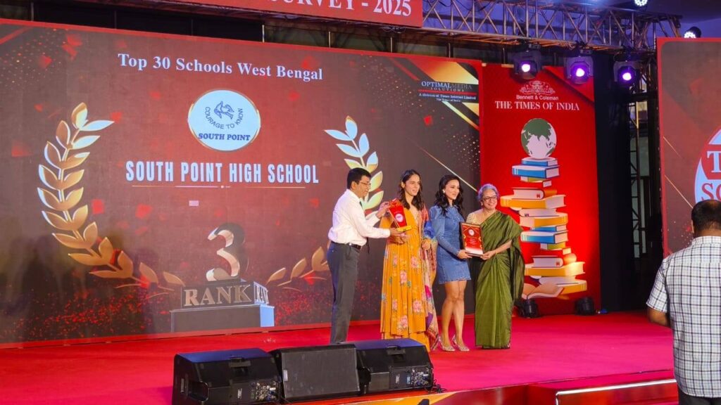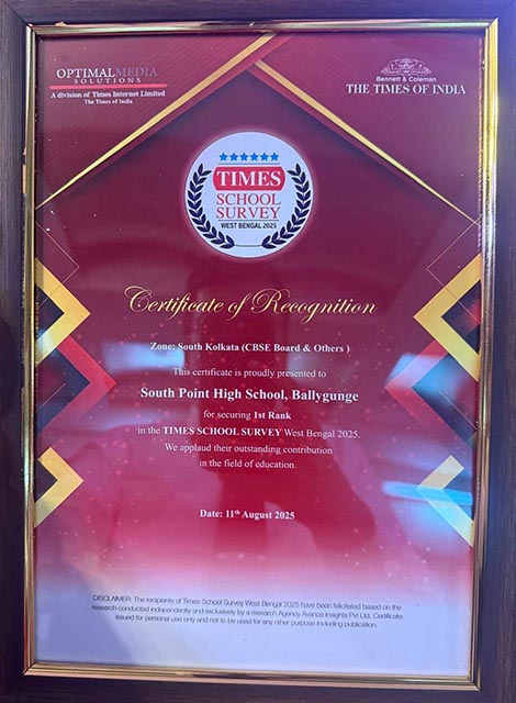 South Point High School was honoured in the above survey presented by Times of India on Monday, August 11, 2025 at ITC Sonar Bangla and received Certificate of Recognition for securing 1st rank in the category Zone: South Kolkata (CBSE Board & Others) and 3rd rank in the category Top School in West Bengal in the Times School Survey West Bengal 2025, in recognition of its outstanding contribution to the field of education. Pupils of our School also received a Certificate of Recognition for their Group Dance performance at the event.
